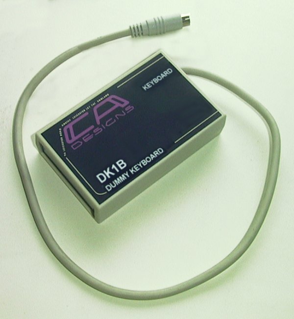| The CA Designs dummy PC keyboard system DK1x enables computers to be booted up without a keyboard attached. Power is derived from the computer and no additional connections are required. The unit comprises one small module connected to the computer via a flying lead.